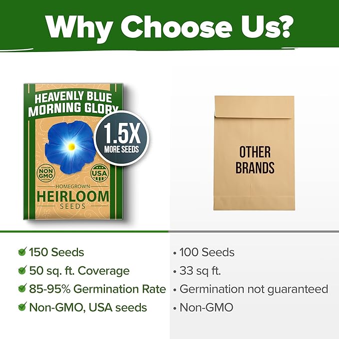 - PREMIUM HEIRLOOM SEEDS WITH EXCELLENT GERMINATION: These open-pollinated, non-GMO Morning Glory seeds deliver a 95β99% germination rate under proper conditions. Each batch is carefully tested and packed in moisture- and light-resistant packaging to maintain seed purity, freshness, and vigorous growth from the start of the season.